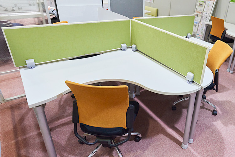 勾玉型の机は組み合わせ可能。つなげれば大人数でも使用できます。